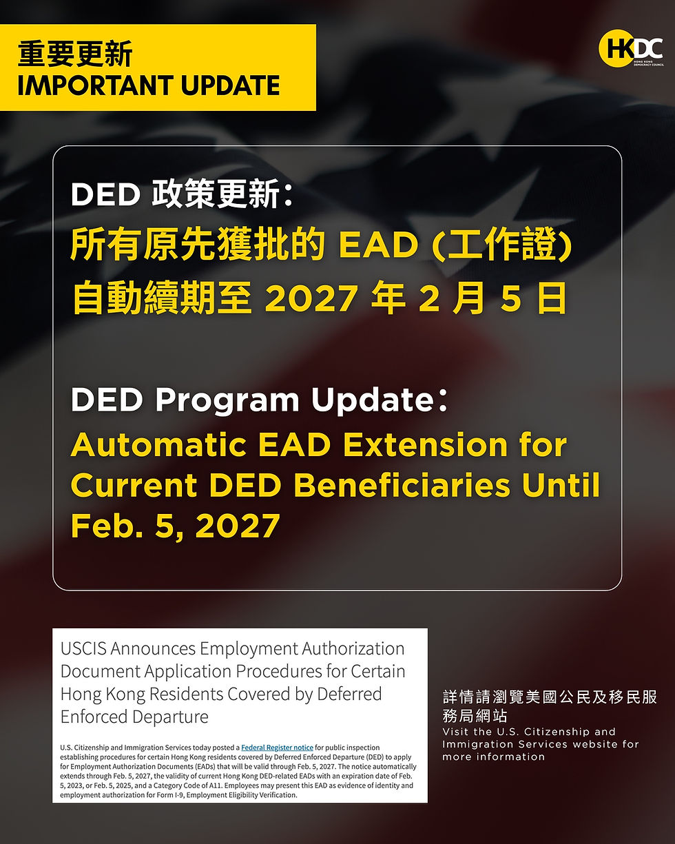 U.S.C.I.S. Confirms Automatic E.A.D. Extension for Current Hong Kong D.E.D. Beneficiaries
